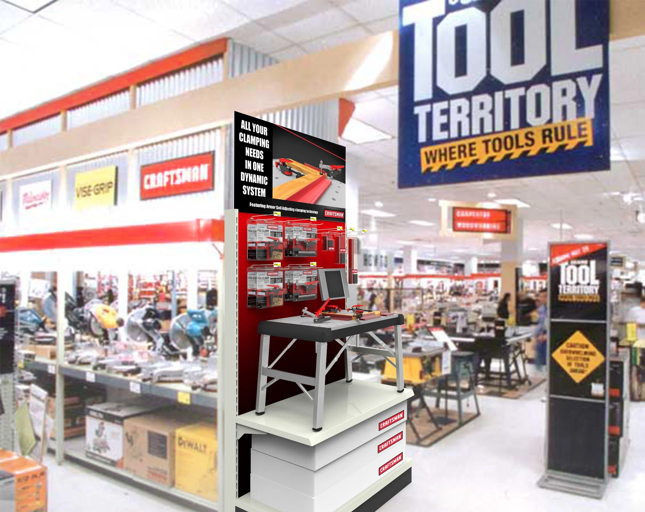 Shortly after the introduction of the Armor Tool brand, PDI’s IP stakeholders were presented with the opportunity to launch the P7 Peg Clamps (Hold-Down and In-Line) as a Craftsman private-label program. The program centered on a portable folding workbench whose removable, replaceable tabletop work surface was designed and engineered to accommodate the P7 clamp system.