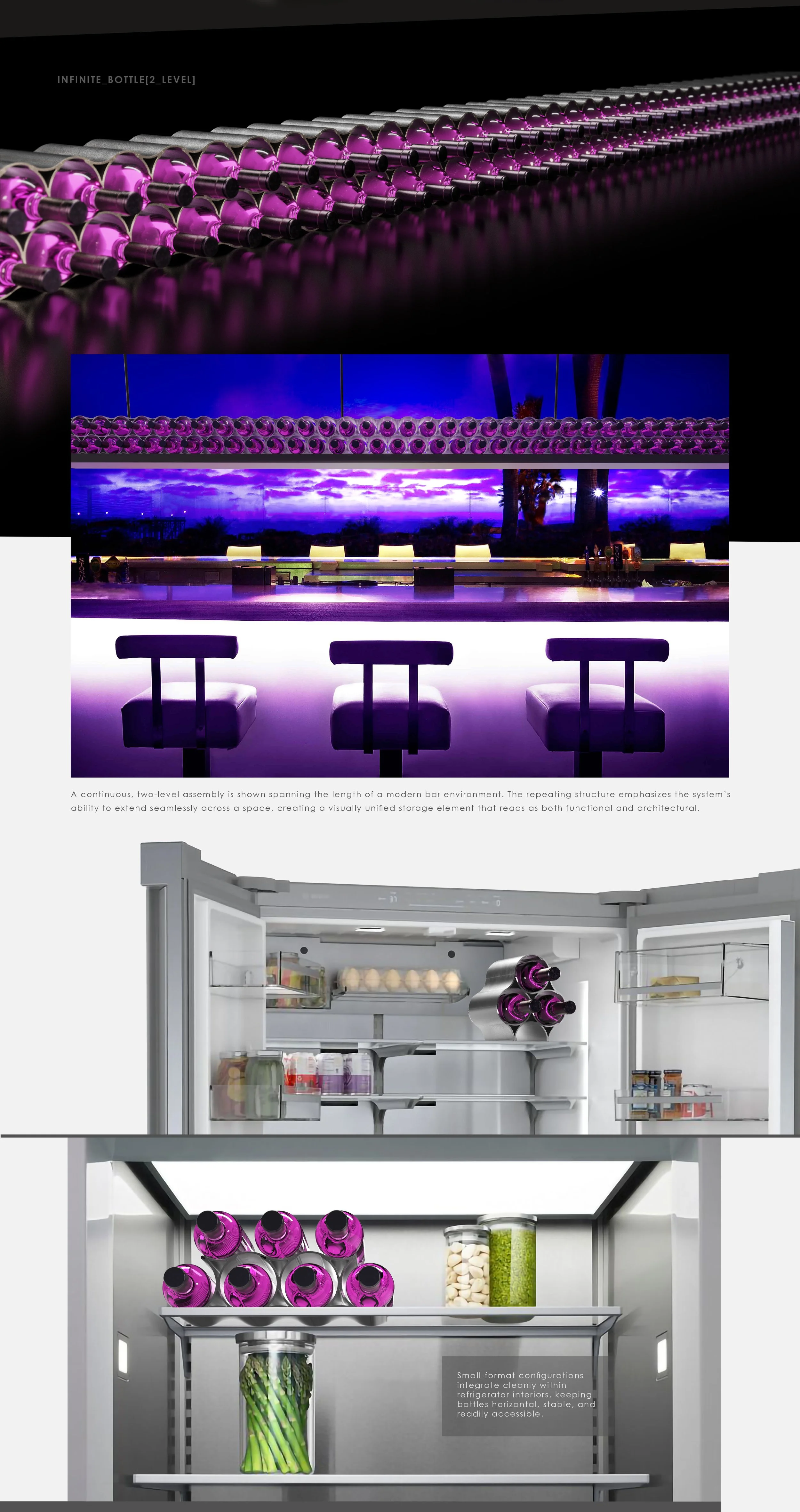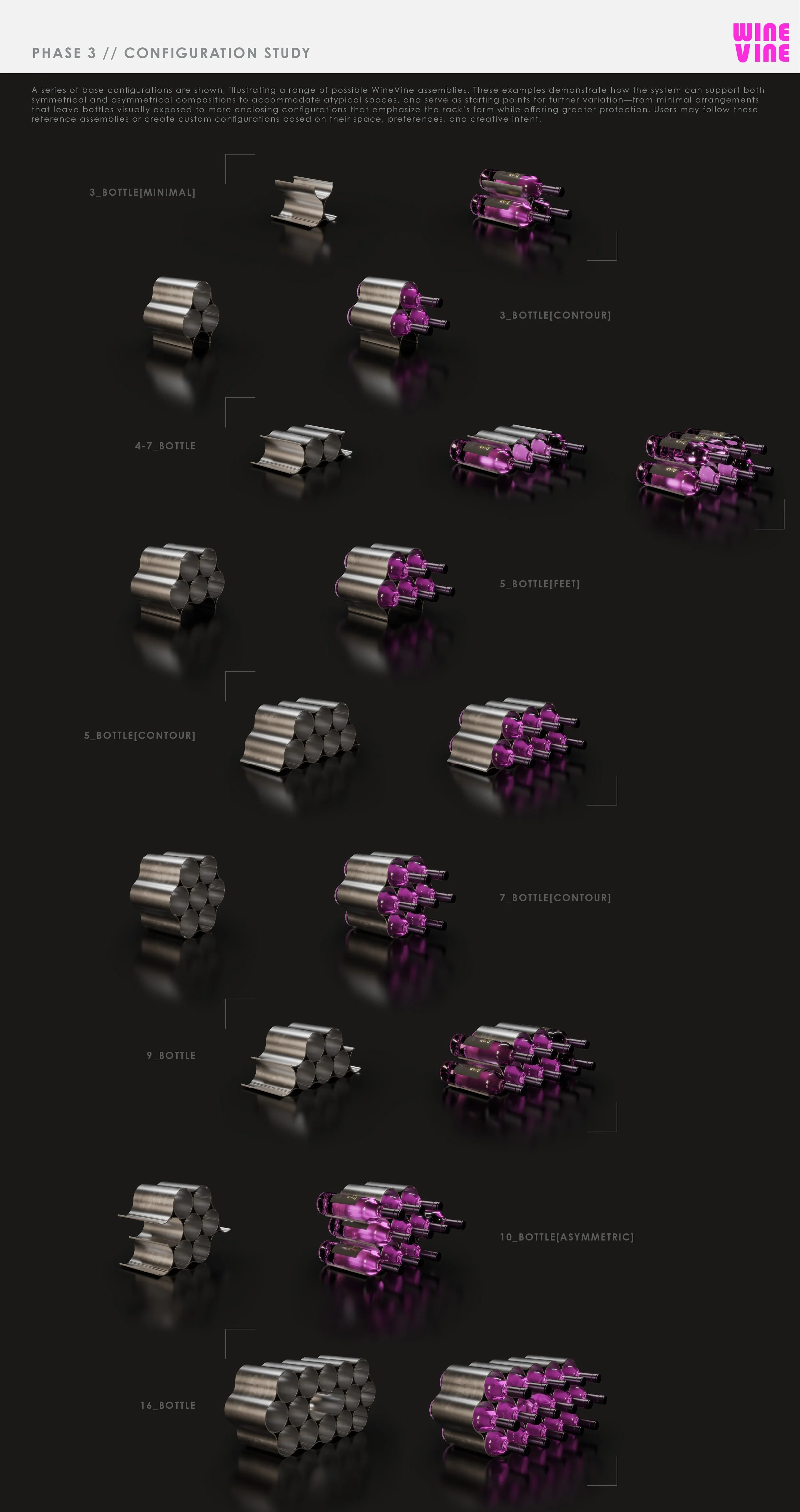 The WineVine is modular bottle storage system that invites the user into the final form, adapting to space and use.